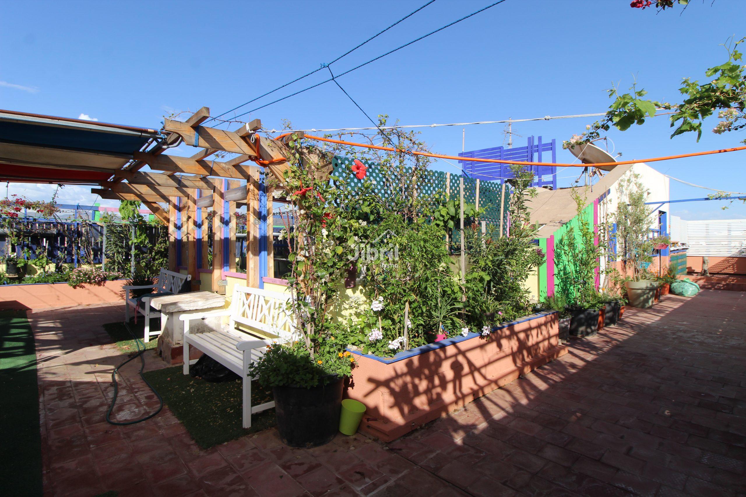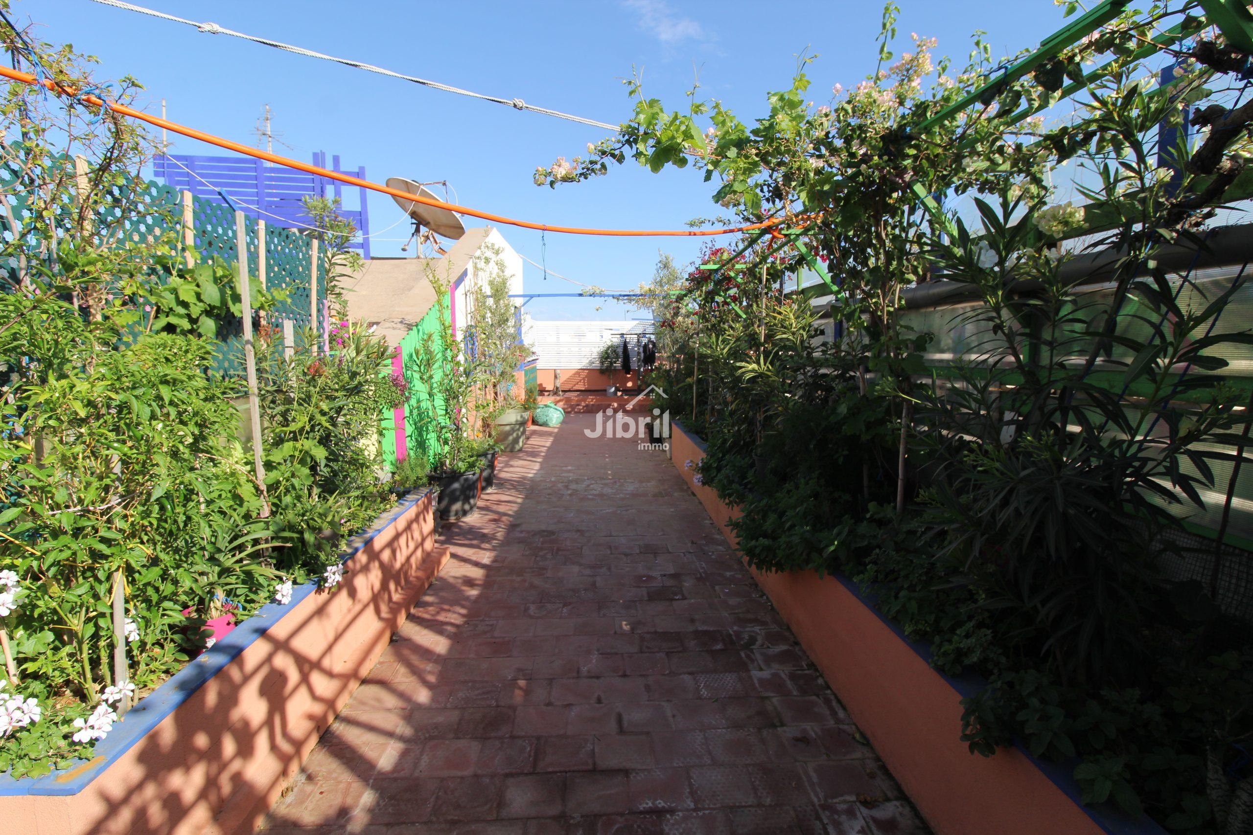 Atout rare : Toit-terrasse commun aménagé avec plantes et espace jardin, idéal pour se détendre en plein air.
