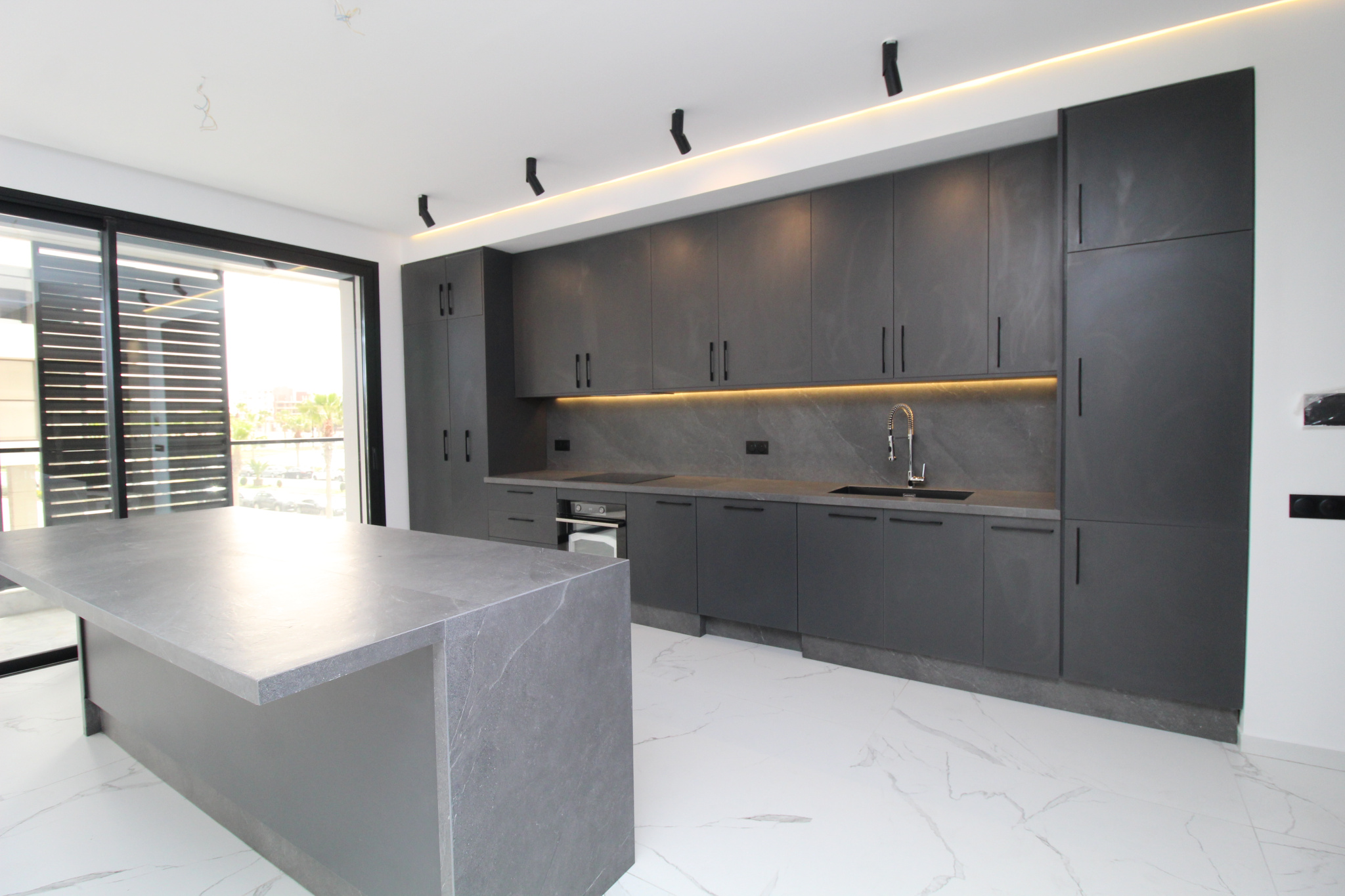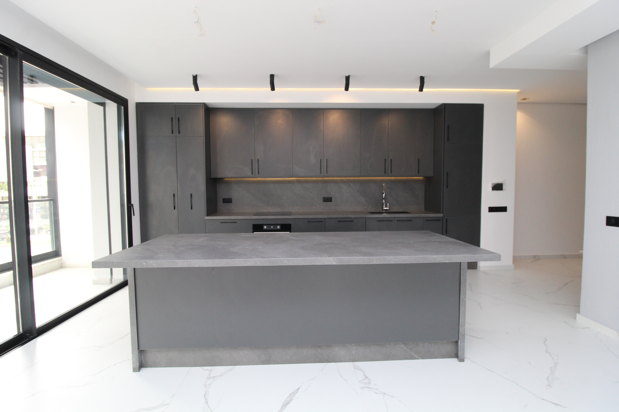 Espaces de vie spacieux : Grande cuisine ouverte, toilettes séparées et un grand balcon qui longe toute la façade.