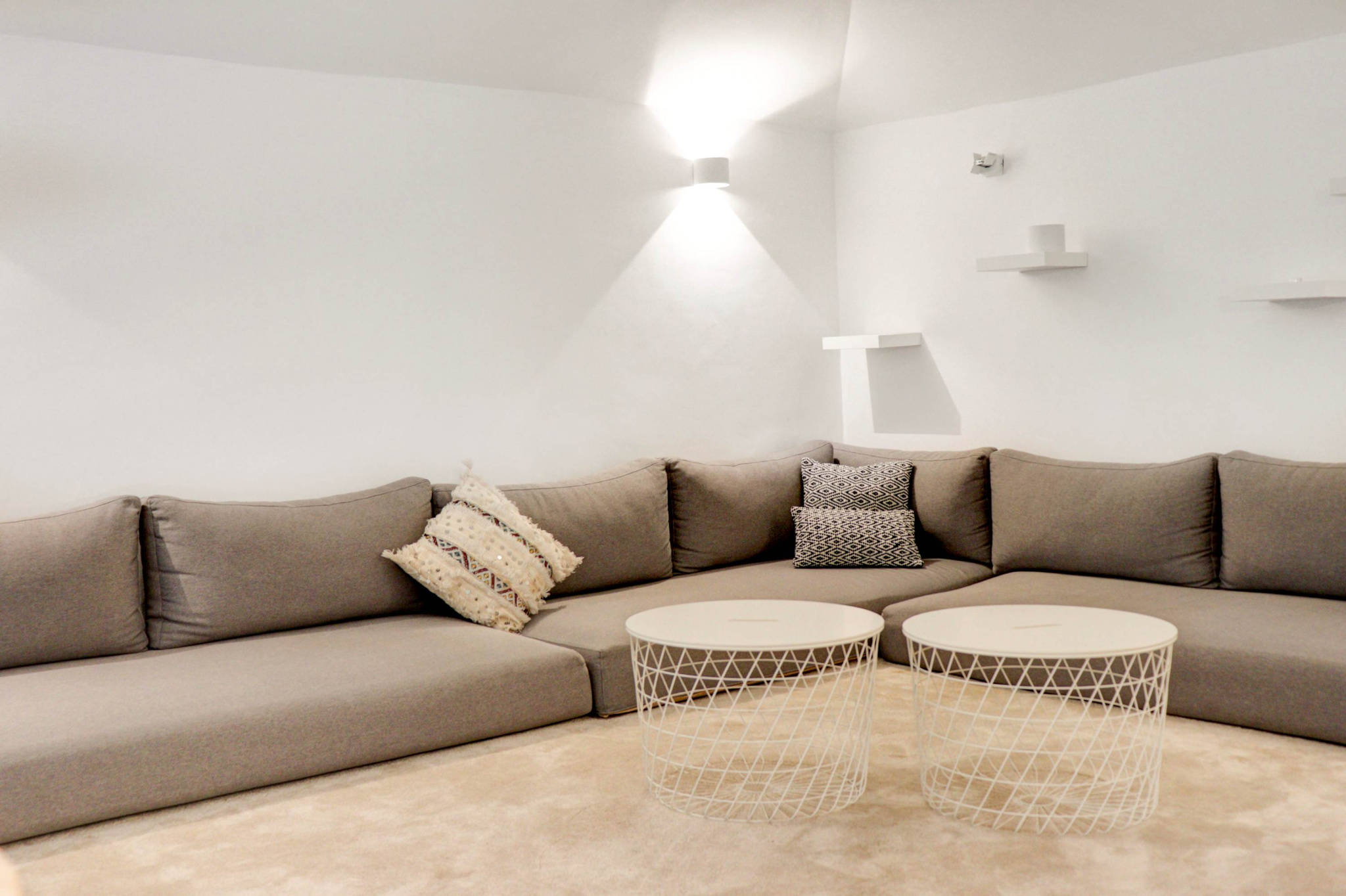 Salon européen lumineux ouvert sur une loggia avec vue mer
