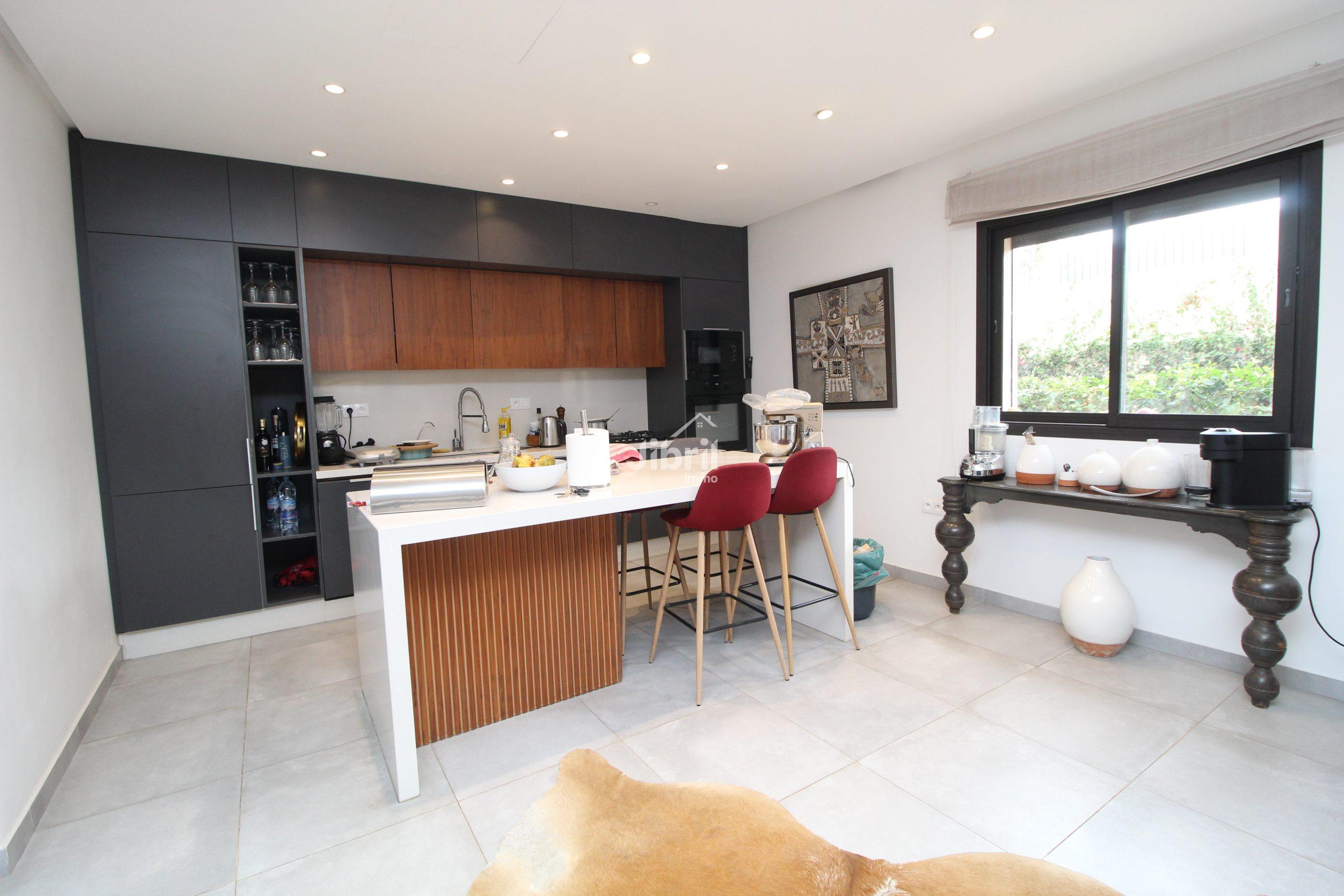 L’agencement fluide entre la cuisine et le séjour crée un véritable espace de vie convivial, tourné vers le jardin et la piscine.