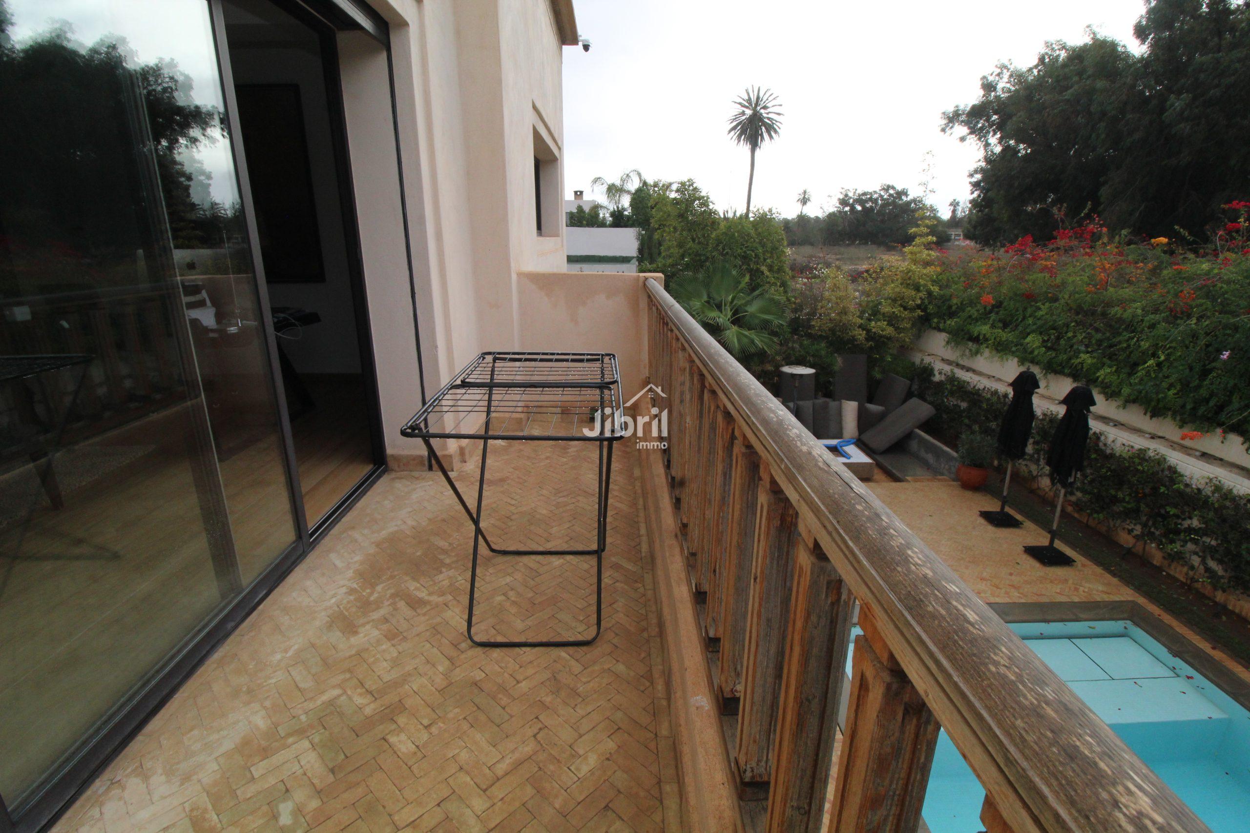 Balcon donnant sur le jardin et la piscine