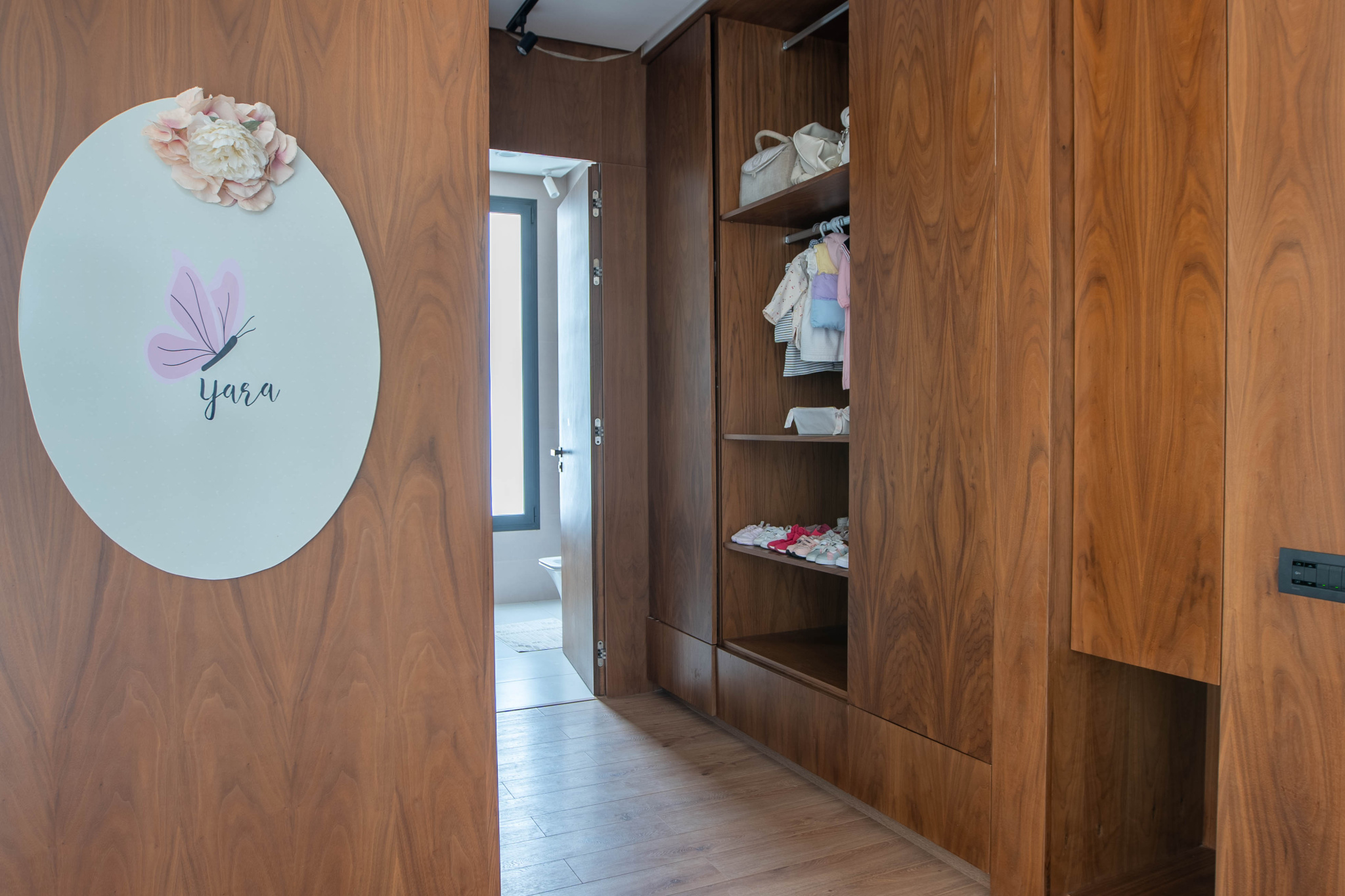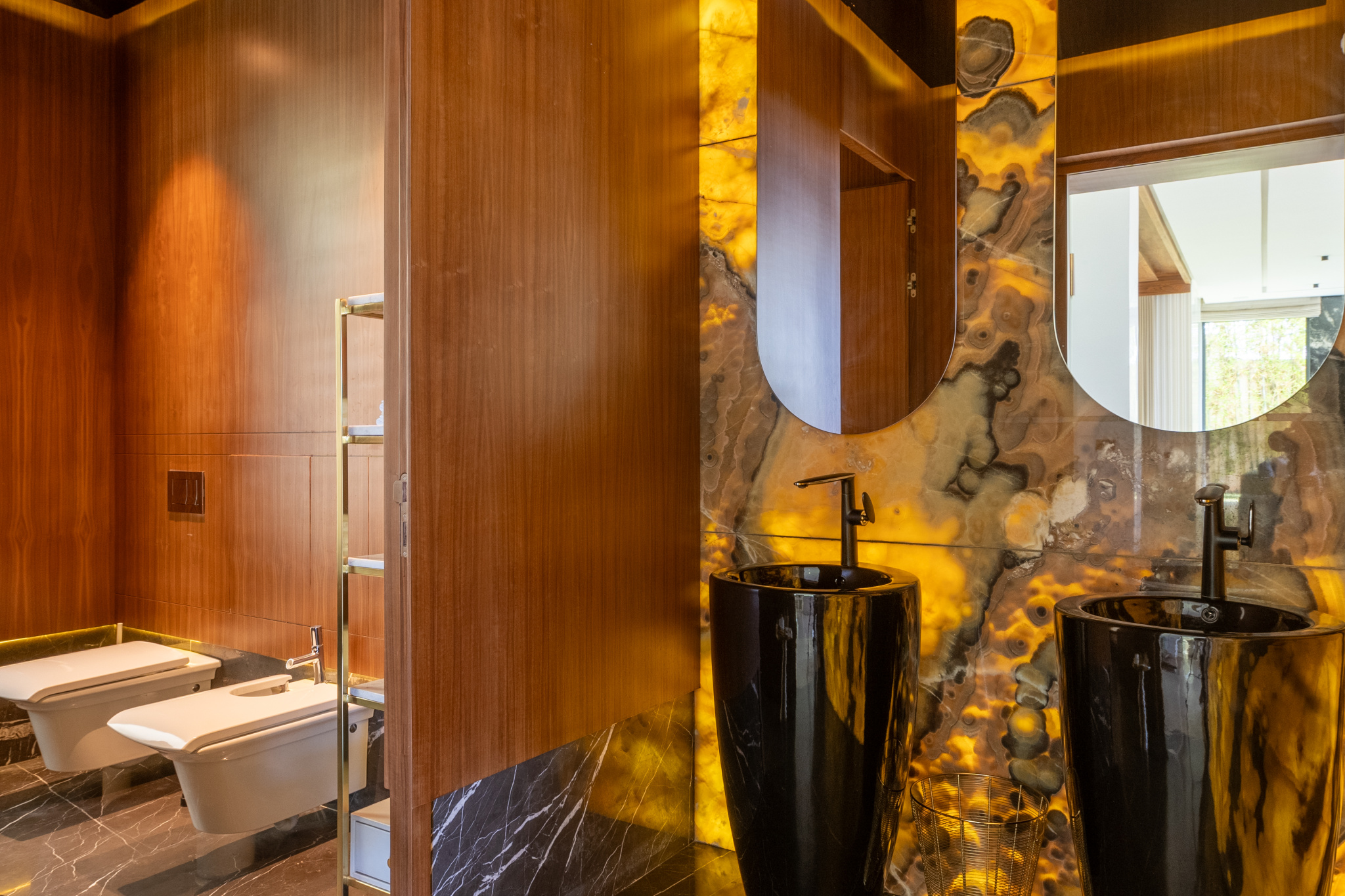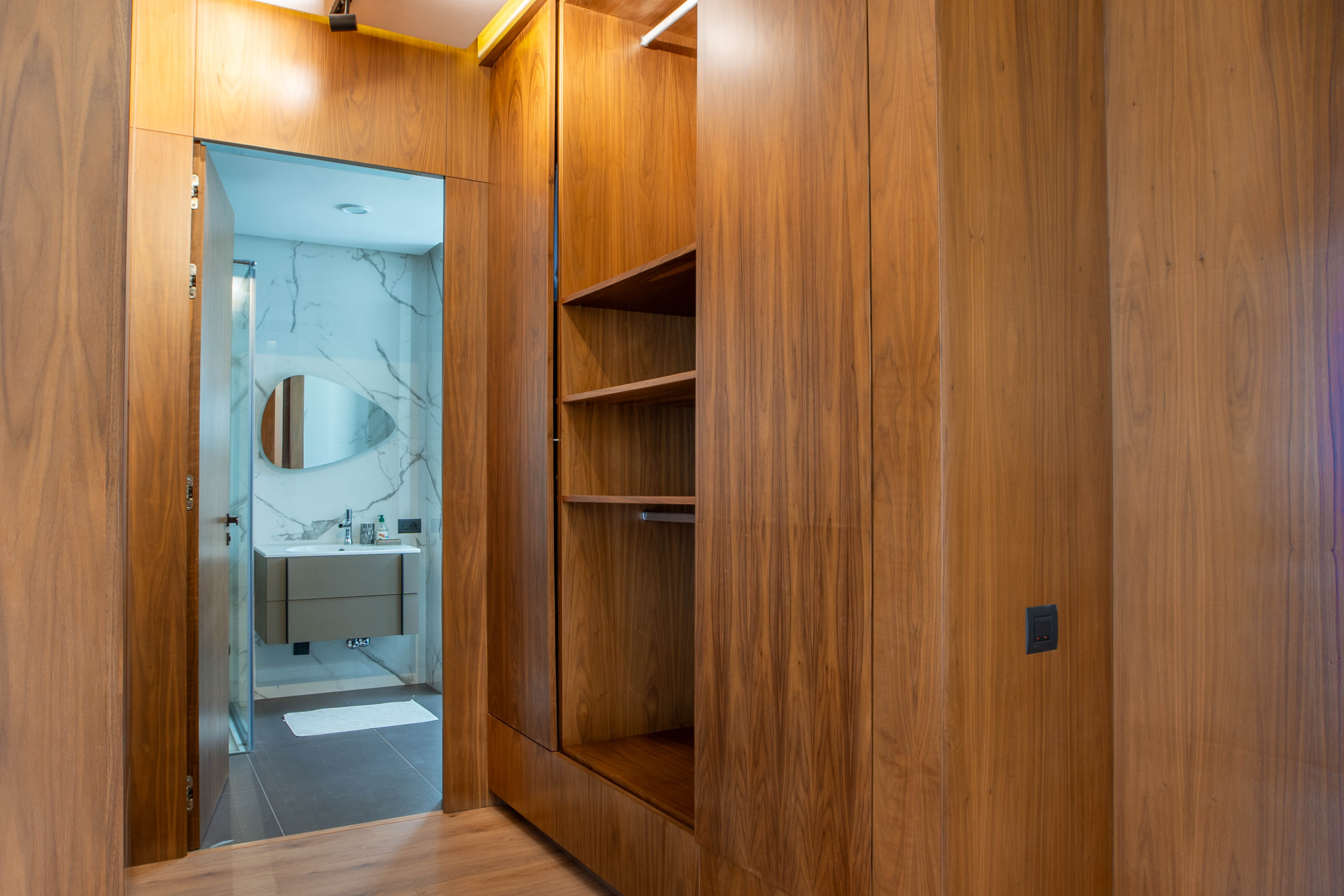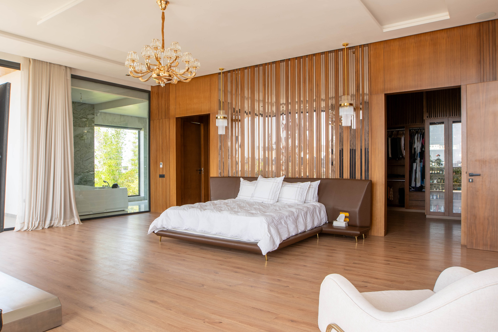 Cinq suites spacieuses et lumineuses, toutes avec dressing en bois haut de gamme et salles de bains équipées de sanitaires Jacob Delafon.