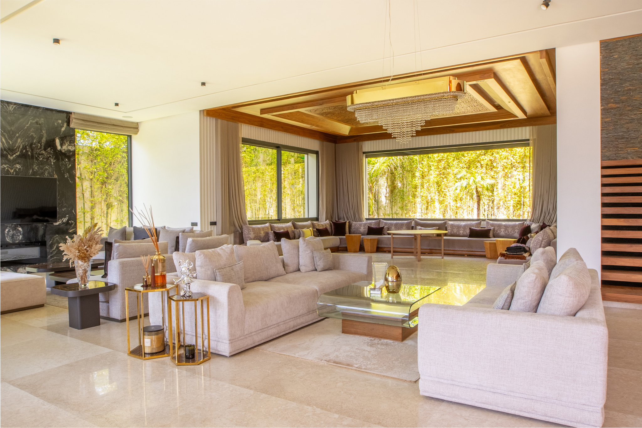 Six salons, dont un salon marocain et un salon de jardin.
