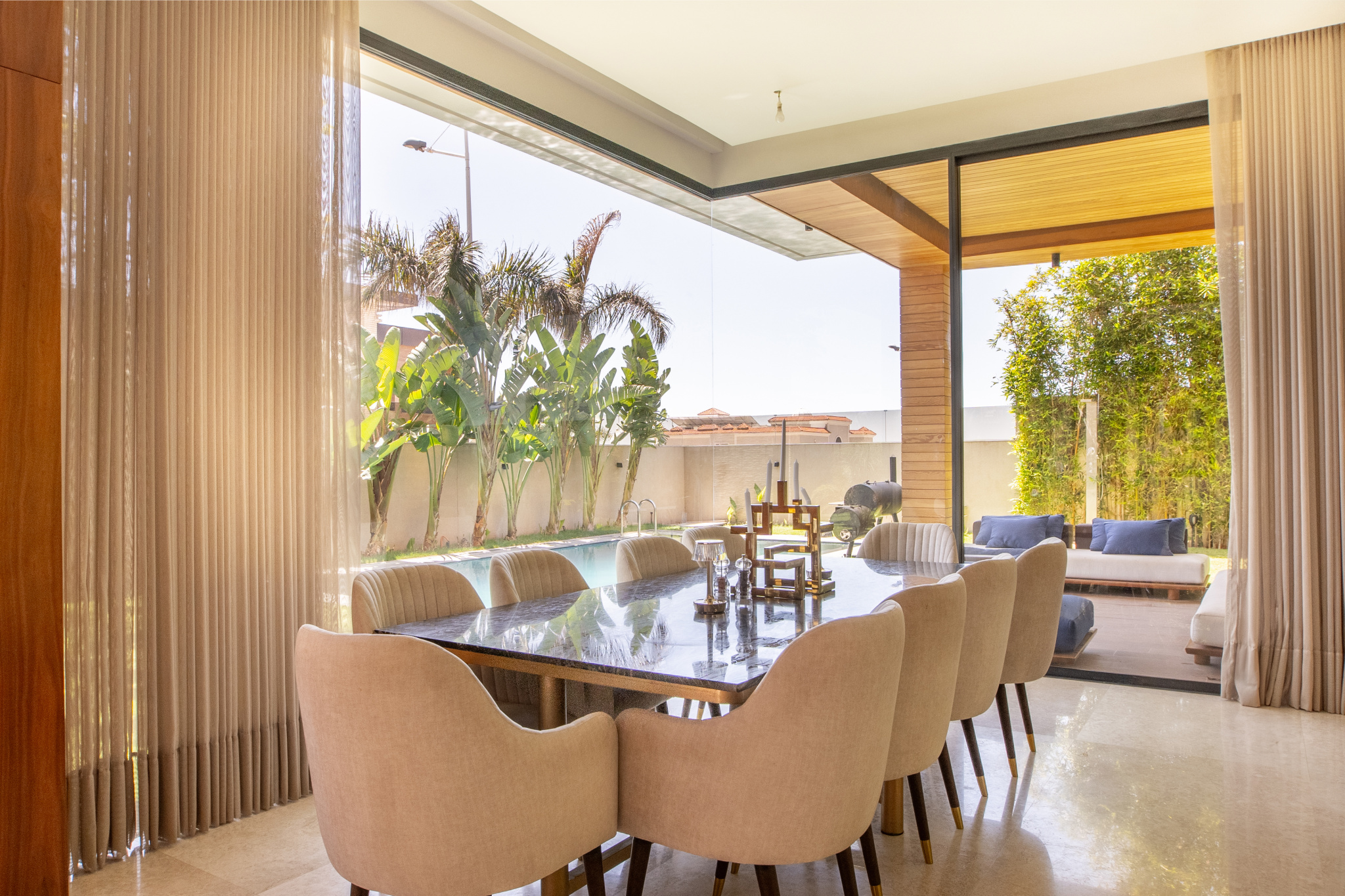 Salle à manger en marbre Open Book avec des chaises confortables.
