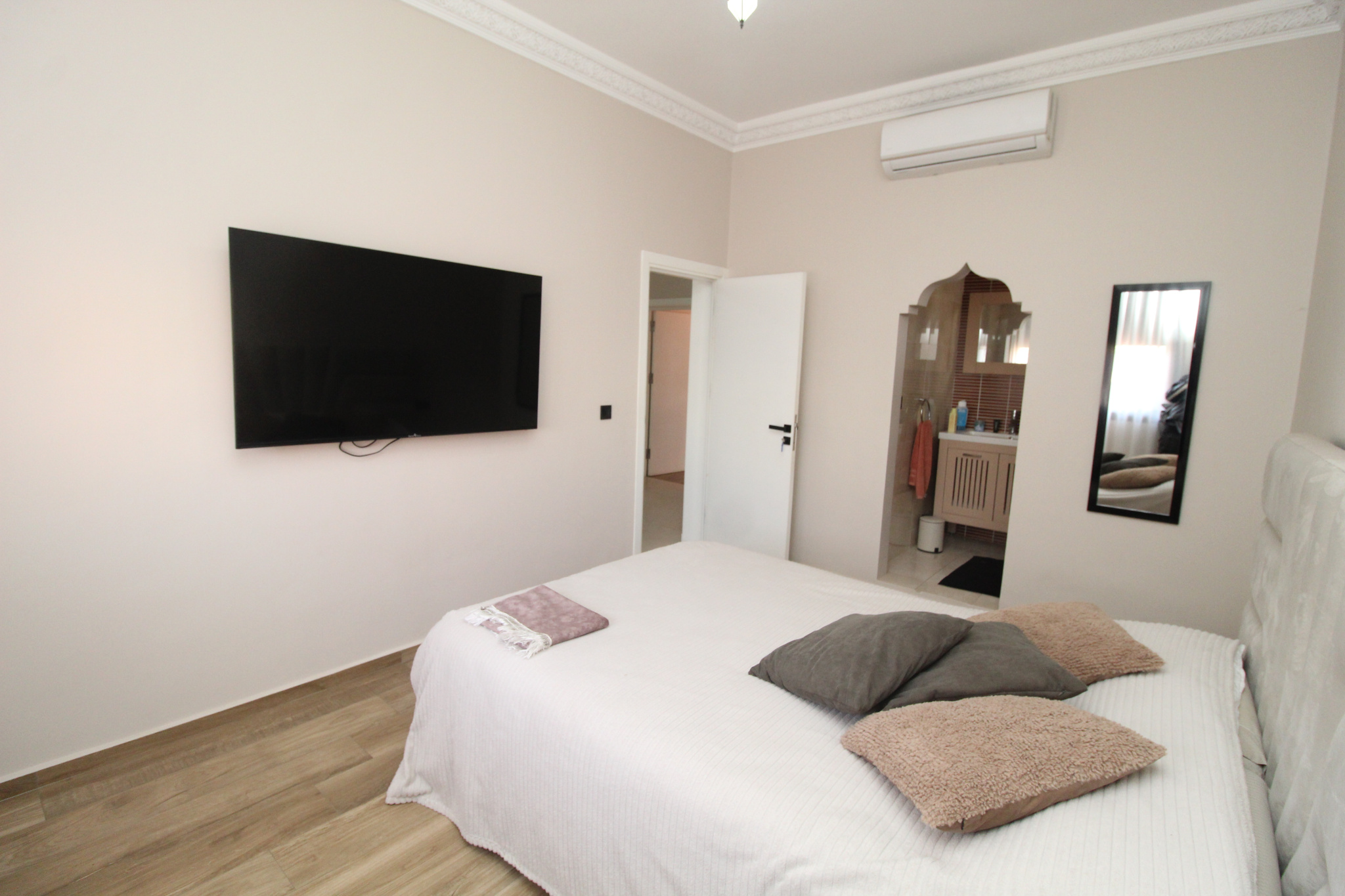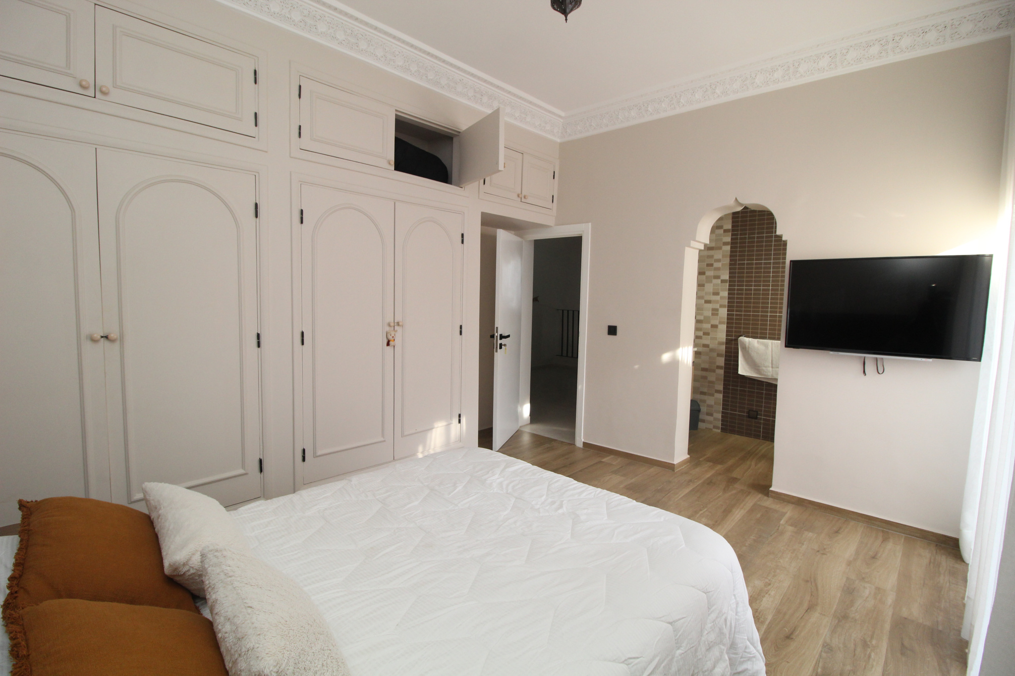 Plusieurs chambres avec salles de douche privatives, rangements intégrés, TV et balcons, offrant à chacun confort et indépendance.